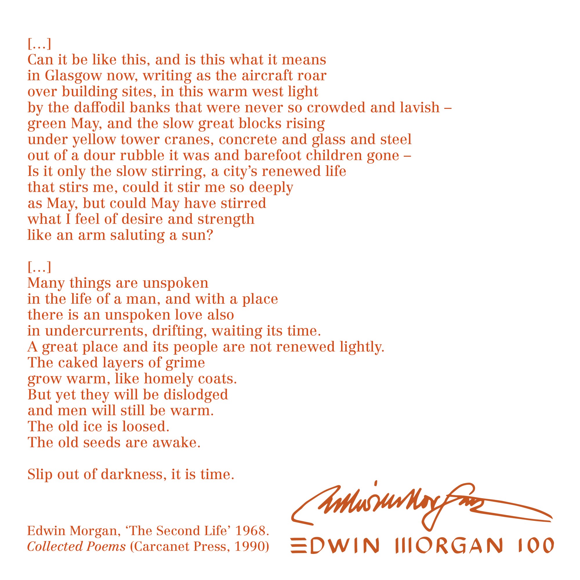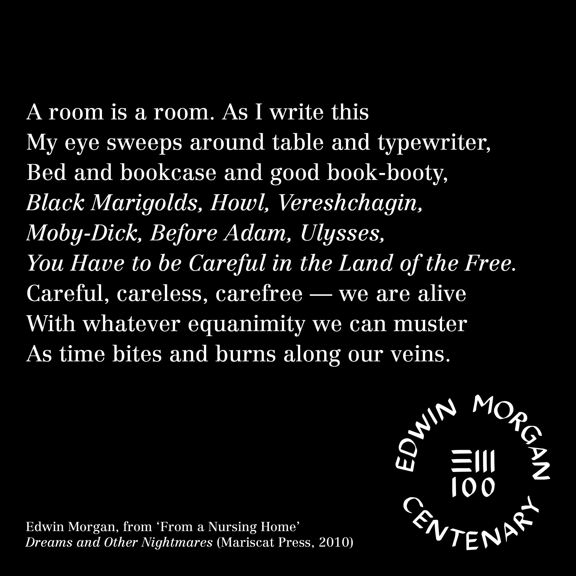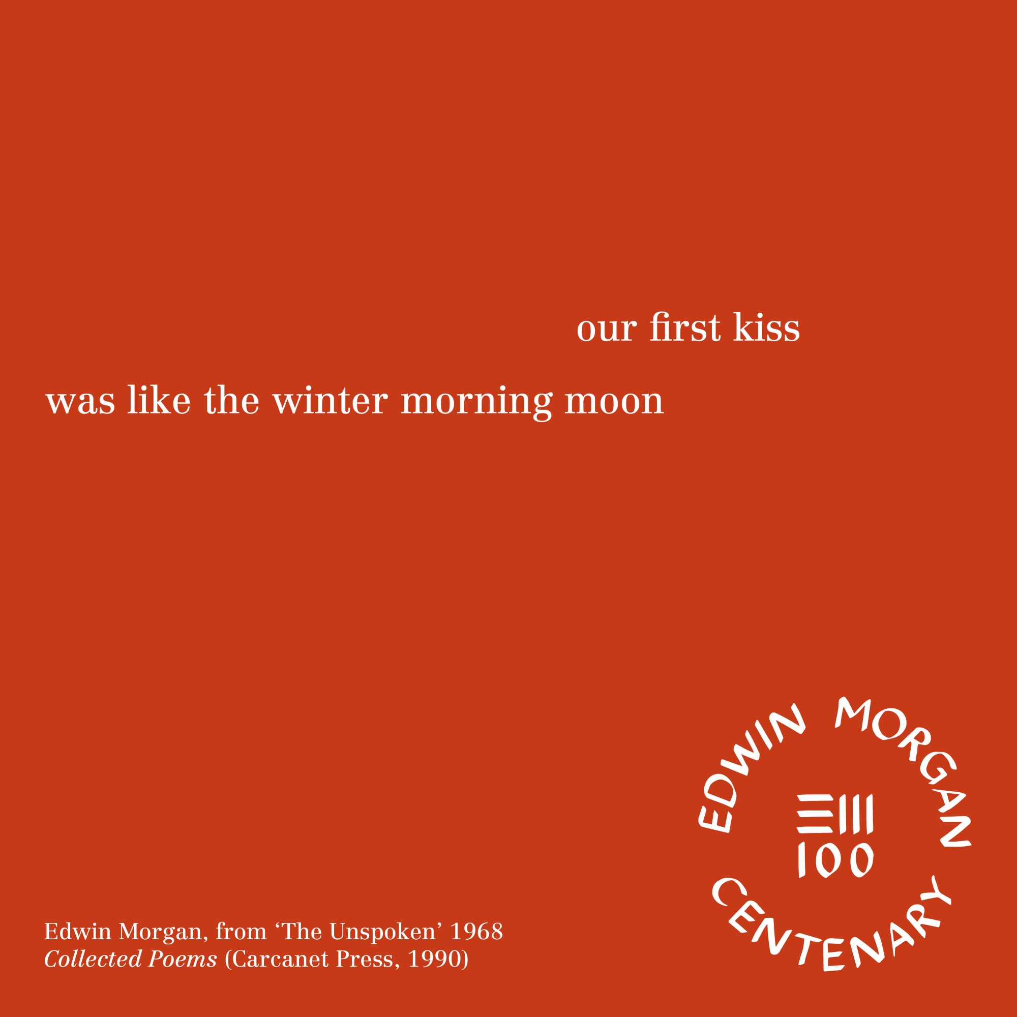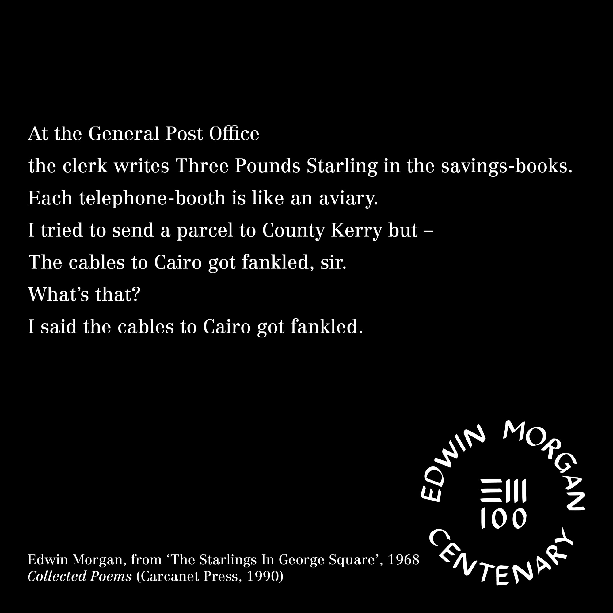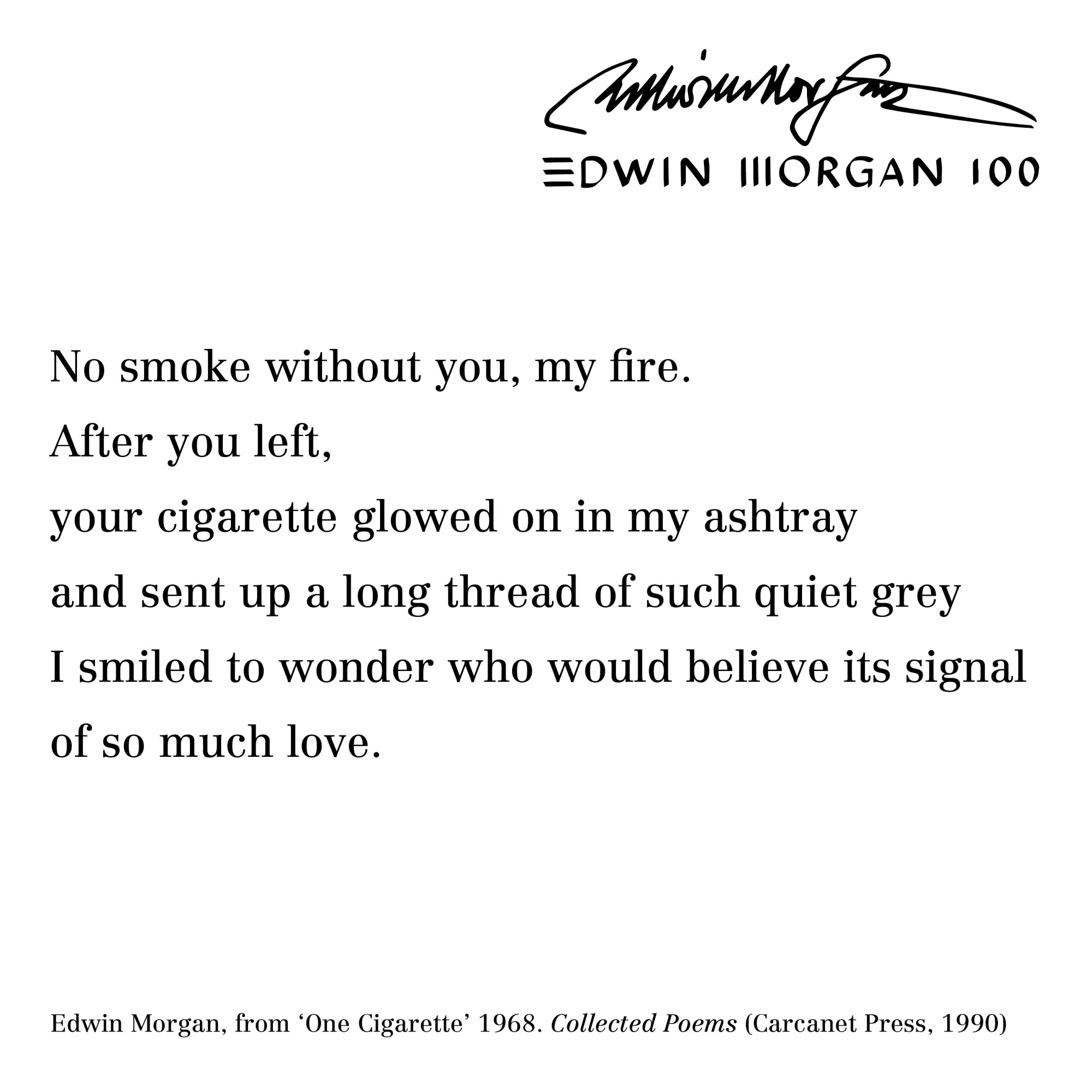 To mark the launch of the Edwin Morgan Centenary on April 27, 2020 – the Edwin Morgan Trust, in partnership with Carcanet Press, are making Edwin Morgan poems and lines available as ‘Birthday Cards’ for sharing online to celebrate Edwin Morgan’s 100th Birthday – April 27.
