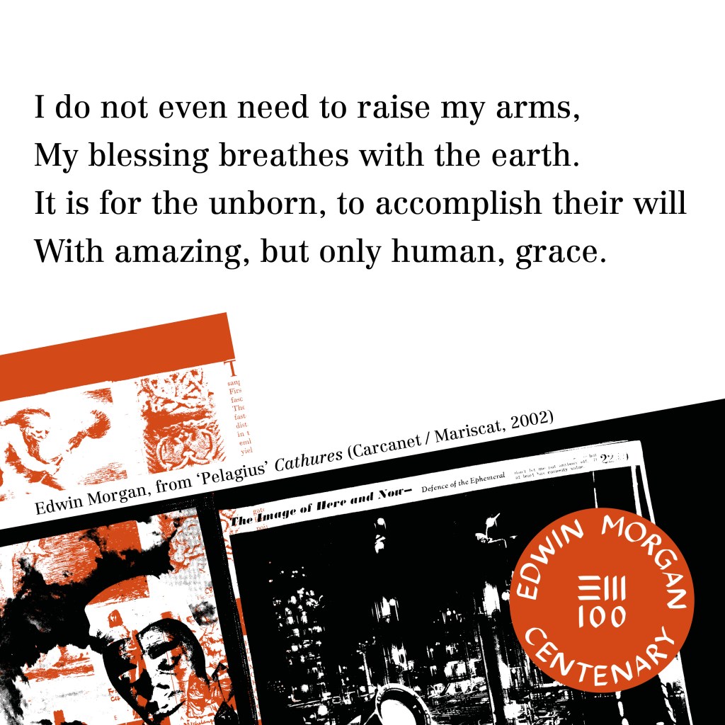 To celebrate the launch of #EdwinMorgan100 on April 27, the Edwin Morgan Trust is teaming up with Carcanet Press to make Edwin Morgan poems available for printing, sharing and enjoying online and at home. We have social media Birthday cards available to download and share – and a selection of #EdwinMorgan100 posters, created by designer Maeve Redmond. They can be downloaded and shared online, or printed to enjoy ‘IRL’.