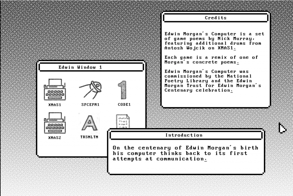 In partnership with the National Poetry Library, we are thrilled to launch an interactive video by Nick Murray for #EdwinMorgan100. Edwin Morgan’s Computer is a set of game poems, each remixing one of Edwin Morgan’s concrete poems into a digital moving video game that can be explored and activated by the user. A selection of video excerpts can be seen below and the full interactive piece can be played here.