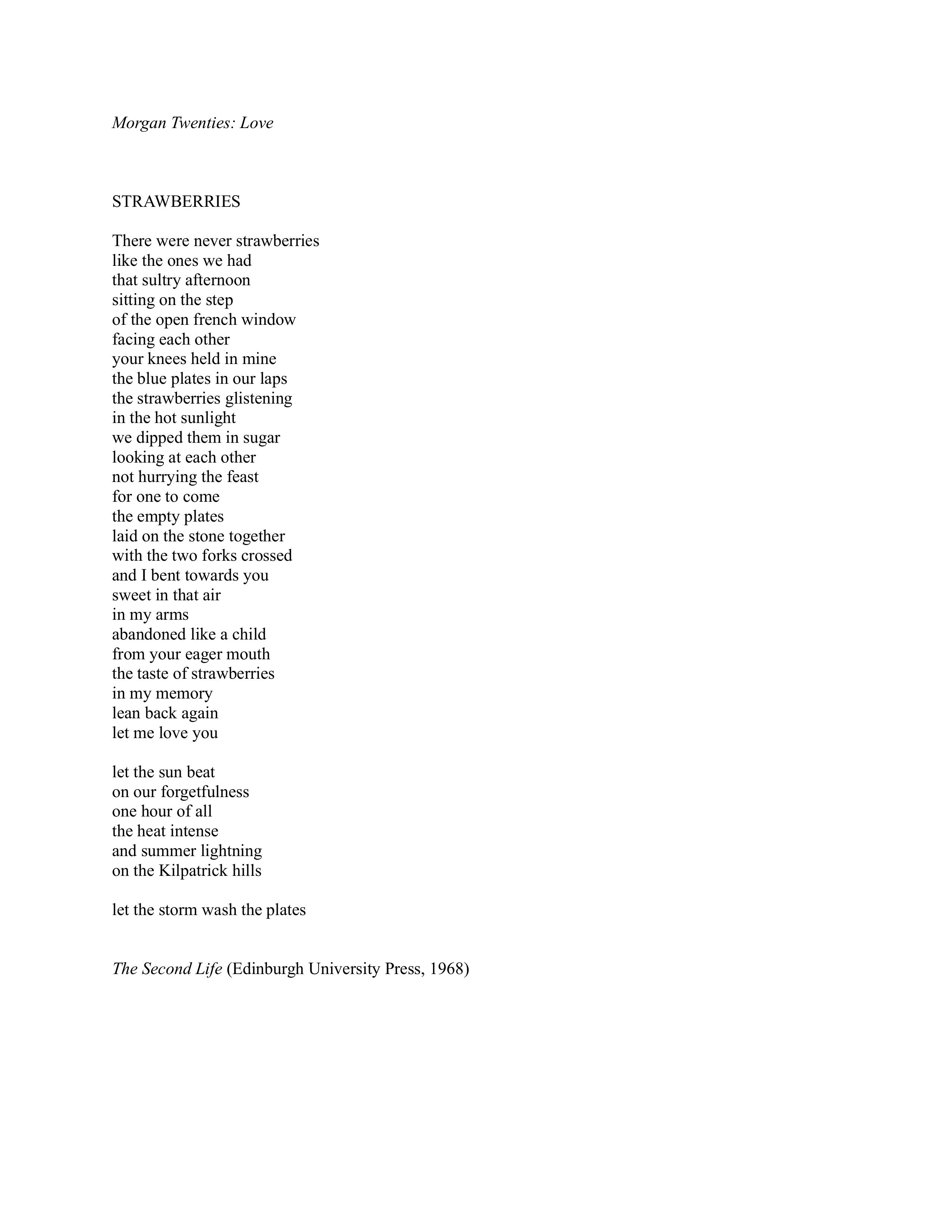 Edwin Morgan Twenties is a series of five selections of 20 poems released for the #edwinmorgan100 centenary. Poems were selected in response to themes of love, being human, animals, space and spaces, and Scotland. Below is a small sample from the Morgan Twenties – which can be purchased online on the Birlinn website.
